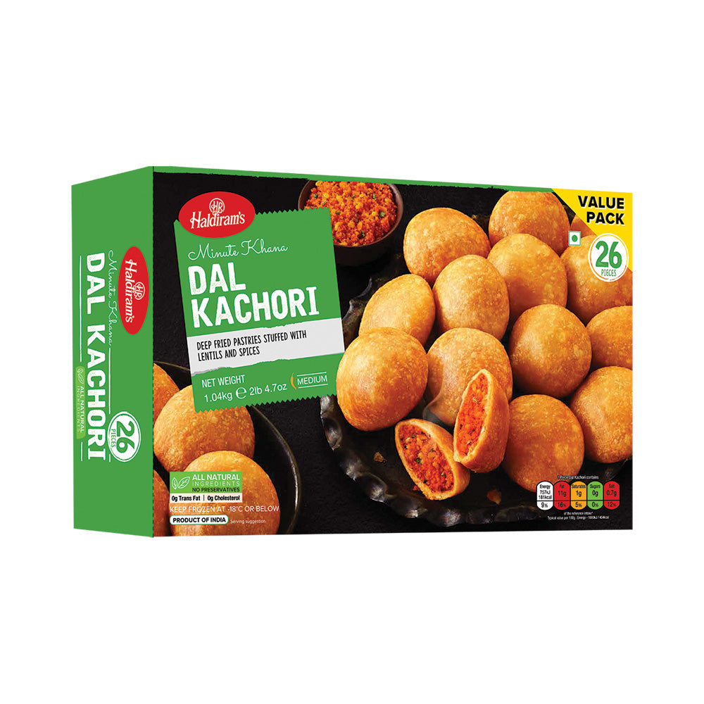 Dal Kachori: Wheat Flour (33%), Water, Refined Sunflower Oil, Chickpea Flour, Split Yellow Lentils, Salt, Spices (Coriander, Cumin, Red Chilli Powder, Mango Powder, Black Pepper, Turmeric, Clove, Ajwain, Fennel Seeds), Dried Fenugreek Leaves, Asafoetida.