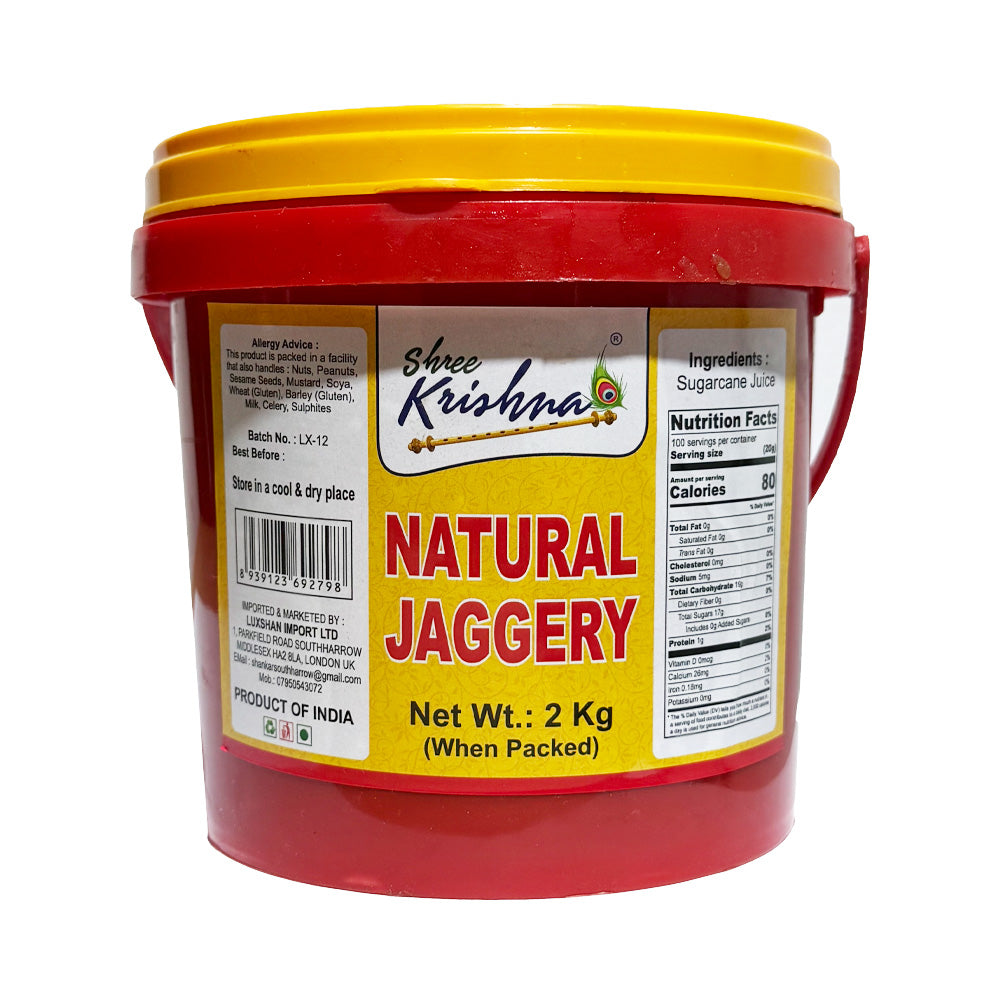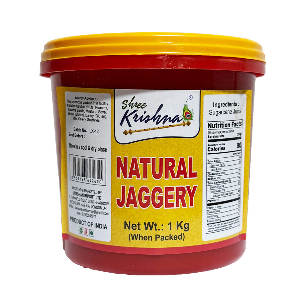 Shree Krishna Natural Jaggery brings the authentic taste of India to your kitchen. Made from pure sugarcane juice without any additives or chemicals, this traditional jaggery is produced using time-honoured methods that preserve its natural goodness. Rich in minerals and nutrients, Shree Krishna jaggery offers a wholesome alternative to refined sugar. Each batch is carefully crafted to deliver that distinctive warm, molasses-like flavour that enhances both sweet and savoury dishes. Perfect for traditional Indian sweets, tea, or as a natural sweetener in your daily cooking. Sourced directly from Indian producers who maintain the highest standards of purity and quality, Shree Krishna Natural Jaggery is a celebration of heritage and natural nutrition in every bite.