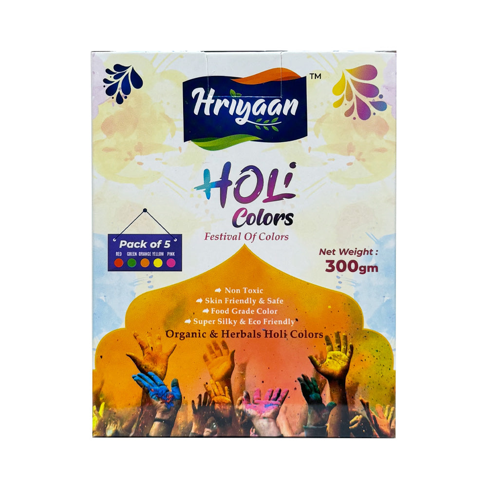 Celebrate Holi with our vibrant pack of 5 organic, herbal colours in red, green, orange, yellow and pink. Crafted from food-grade ingredients, these silky-smooth powders are completely non-toxic and skin-friendly, making them safe for the whole family. Eco-conscious and gentle on skin, our Hriyaan colours deliver brilliant, long-lasting hues while honouring traditional values with natural, sustainable ingredients. Non Toxic, Organic & Herbal, Skin Friendly & Safe, Food Grade Colour, Super Silky & Eco Friendly.
